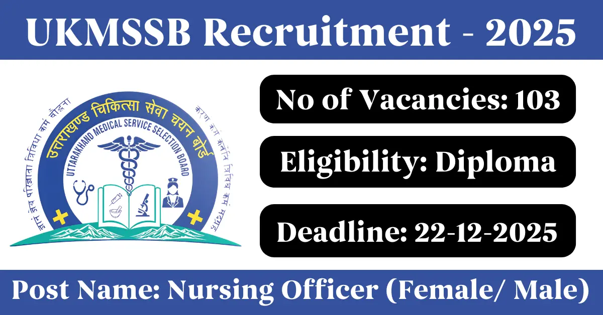 UKMSSB Recruitment 2025: Apply for 103 Nursing Officer vacancies. Uttarakhand Medical Service Selection Board invited applications from eligible and interested candidates to fill up Nursing Officer Posts through UKMSSB official notification November 2025. Job seekers who are looking for a career in Uttarakhand Government can make use of this opportunity. Interested candidates can Apply Online on or before 22-Dec-2025