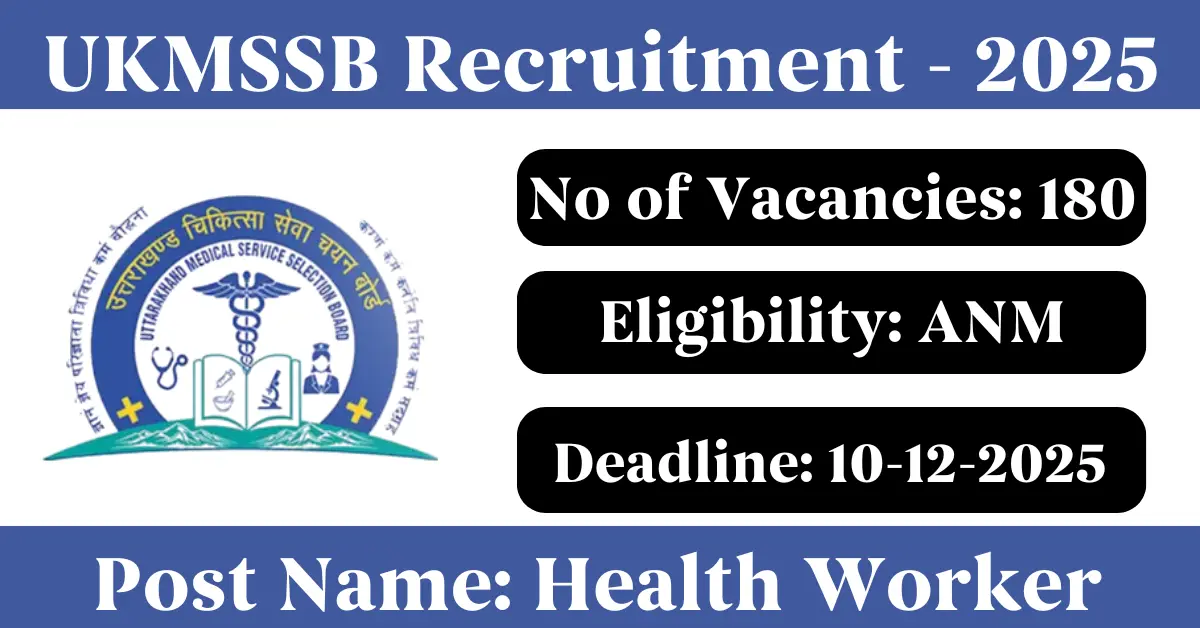 UKMSSB Recruitment 2025: Apply for 180 Health Worker vacancies. Uttarakhand Medical Service Selection Board invited applications from eligible and interested candidates to fill up Health Worker Posts through UKMSSB official notification November 2025. Job seekers who are looking for a career in Uttarakhand Government can make use of this opportunity. Interested candidates can Apply Online on or before 10-Dec-2025