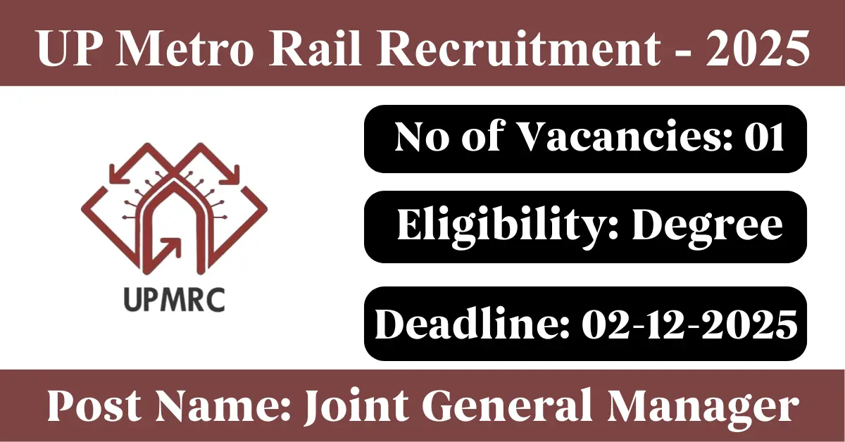UP Metro Rail Recruitment 2025: Apply for 1 Joint General Manager vacancies. Uttar Pradesh Metro Rail Corporation Ltd invited applications from eligible and interested candidates to fill up Joint General Manager Posts through UP Metro Rail official notification November 2025. Job seekers who are looking for a career in Lucknow – Uttar Pradesh Government can make use of this opportunity. Interested candidates can Apply Offline on or before 02-Dec-2025