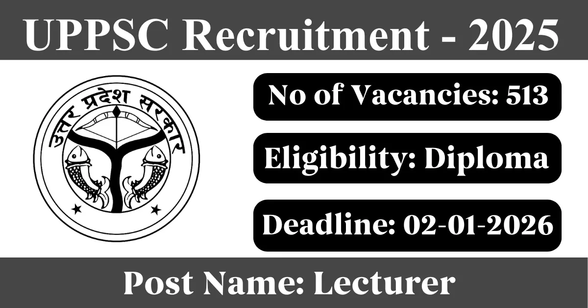 UPPSC Recruitment 2025: Apply for 513 Lecturer vacancies. Uttar Pradesh Public Service Commission invited applications from eligible and interested candidates to fill up Lecturer Posts through UPPSC official notification December 2025. Job seekers who are looking for a career in Uttar Pradesh Government can make use of this opportunity. Interested candidates can Apply Online on or before 02-Jan-2026