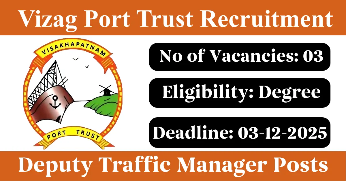 Vizag Port Trust Recruitment 2025: Apply for 3 Deputy Traffic Manager vacancies. Visakhapatnam Port Trust invited applications from eligible and interested candidates to fill up Deputy Traffic Manager Posts through Vizag Port Trust official notification November 2025. Job seekers who are looking for a career in Visakhapatnam – Andhra Pradesh Government can make use of this opportunity. Interested candidates can Apply Online/Offline on or before 03-Dec-2025