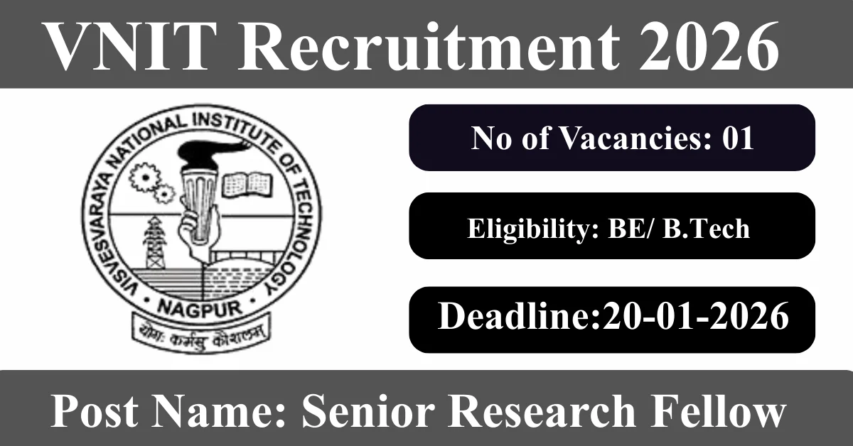 VNIT Recruitment 2026: Apply for 1 Senior Research Fellow vacancies. Visvesvaraya National Institute of Technology invited applications from eligible and interested candidates to fill up Senior Research Fellow Posts through VNIT official notification January 2026. Job seekers who are looking for a career in Nagpur – Maharashtra Government can make use of this opportunity. Interested candidates can send an E-Mail on or before 20-Jan-2026