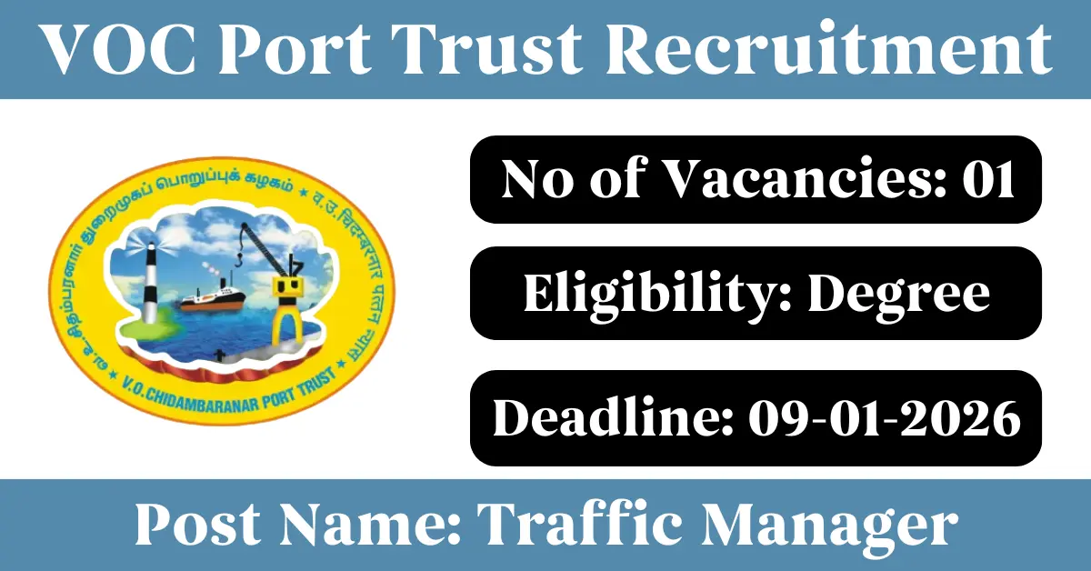 VOC Port Trust Recruitment 2025: Apply for 1 Traffic Manager vacancies. V. O. Chidambaranar Port Trust invited applications from eligible and interested candidates to fill up Traffic Manager Posts through VOC Port Trust official notification December 2025. Job seekers who are looking for a career in Tuticorin – Tamil Nadu Government can make use of this opportunity. Interested candidates can Apply Online/Offline on or before 09-Jan-2026