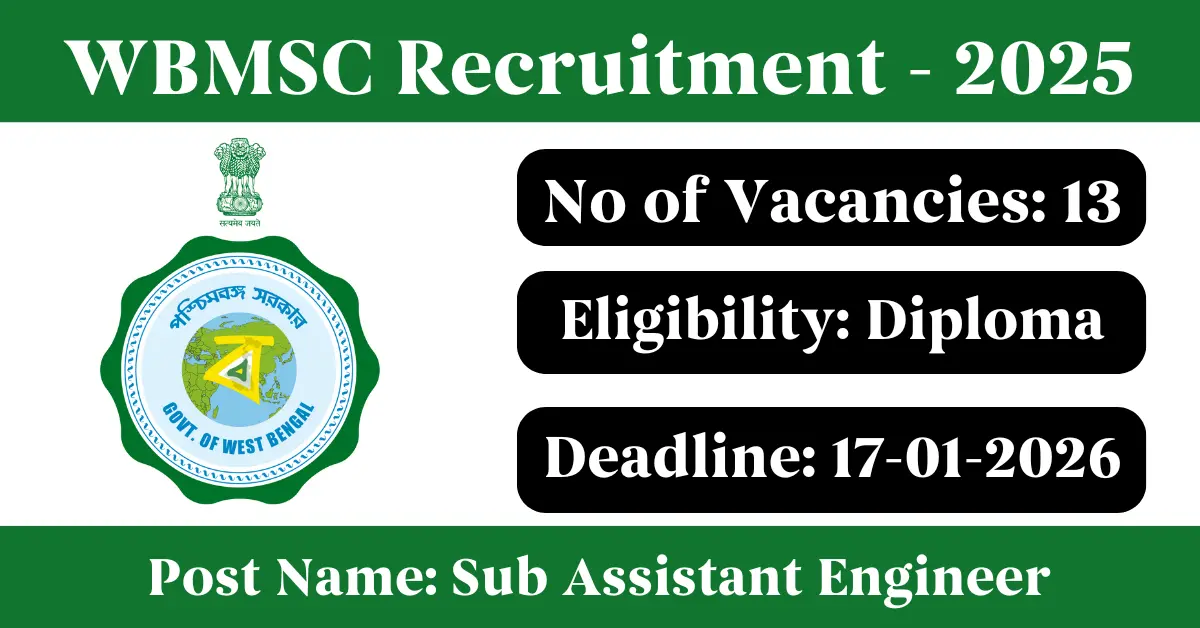 WBMSC Recruitment 2025: Apply for 13 Sub Assistant Engineer, Lower Division Clerk vacancies. West Bengal Municipal Service Commission invited applications from eligible and interested candidates to fill up Sub Assistant Engineer, Lower Division Clerk Posts through WBMSC official notification December 2025. Job seekers who are looking for a career in Kolkata – West Bengal Government can make use of this opportunity. Interested candidates can Apply Online on or before 17-Jan-2026