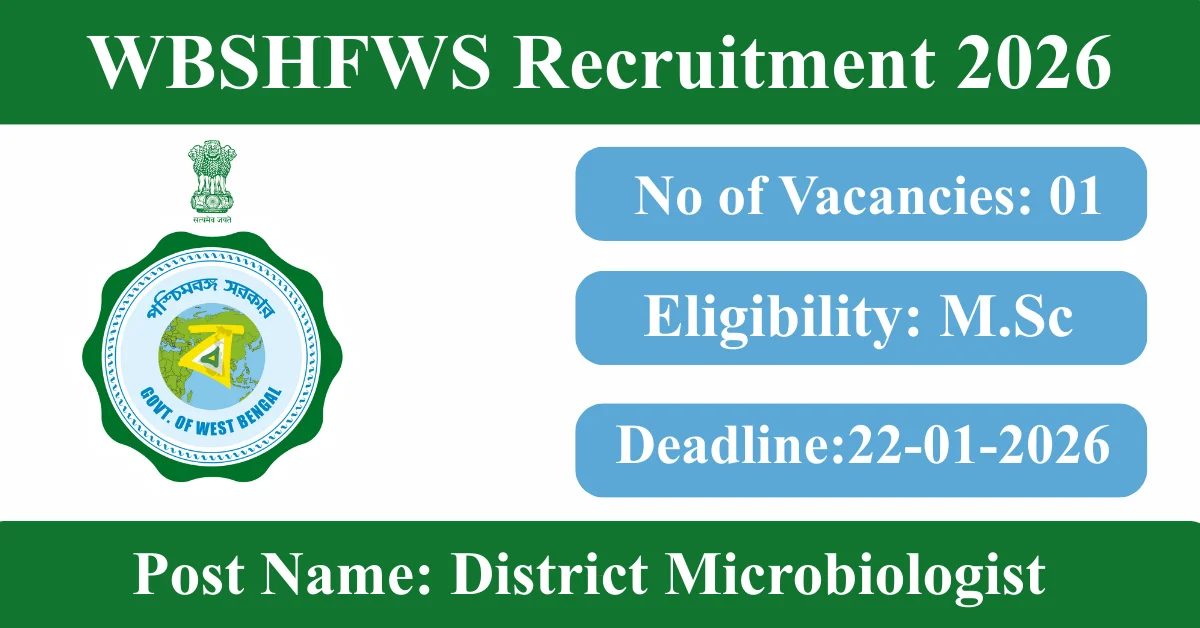 WBSHFWS Recruitment 2026: Apply for 1 District Microbiologist vacancies. West Bengal State Health & Family Welfare Samiti invited applications from eligible and interested candidates to fill up District Microbiologist Posts through WBSHFWS official notification January 2026. Job seekers who are looking for a career in West Bengal Government can make use of this opportunity. Interested candidates can Apply Online on or before 22-Jan-2026