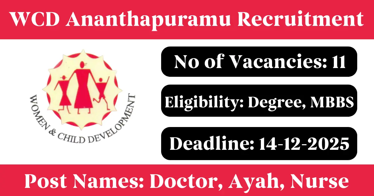 WCD Ananthapuramu Recruitment 2025: Apply for 11 Doctor, Ayah vacancies. Women and Child Development Ananthapuramu invited applications from eligible and interested candidates to fill up Doctor, Ayah Posts through WCD Ananthapuramu official notification December 2025. Job seekers who are looking for a career in Ananthapuramu – Andhra Pradesh Government can make use of this opportunity. Interested candidates can Apply Offline on or before 14-Dec-2025