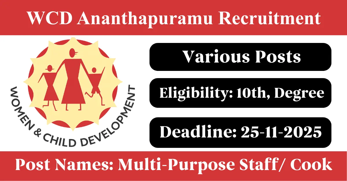 WCD Ananthapuramu Recruitment 2025: Apply for Various Multi-Purpose Staff/ Cook vacancies. Women and Child Development Ananthapuramu invited applications from eligible and interested candidates to fill up Multi-Purpose Staff/ Cook Posts through WCD Ananthapuramu official notification November 2025. Job seekers who are looking for a career in Ananthapuramu – Andhra Pradesh Government can make use of this opportunity. Interested candidates can Apply Offline on or before 25-Nov-2025