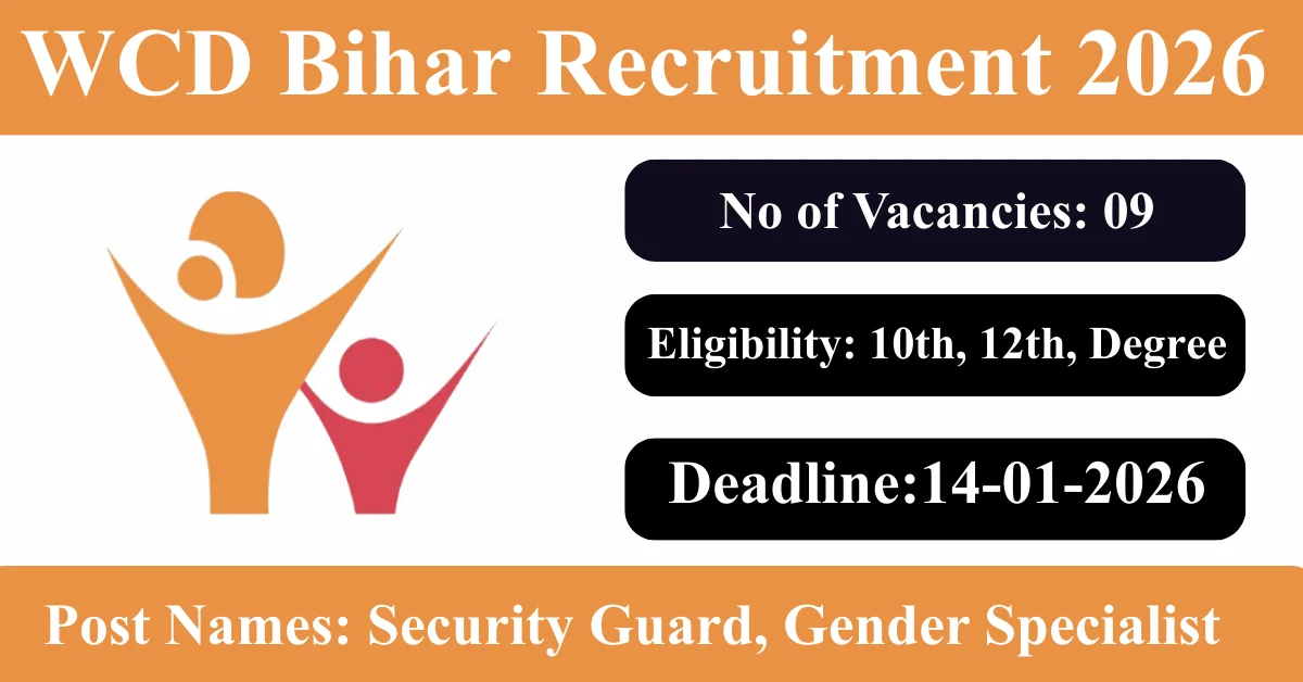 WCD Bihar Recruitment 2026: Apply for 9 Security Guard, Gender Specialist vacancies. Women and Child Development Corporation Bihar invited applications from eligible and interested candidates to fill up Security Guard, Gender Specialist Posts through WCD Bihar official notification January 2026. Job seekers who are looking for a career in East Champaran – Bihar Government can make use of this opportunity. Interested candidates can send an E-Mail on or before 14-Jan-2026