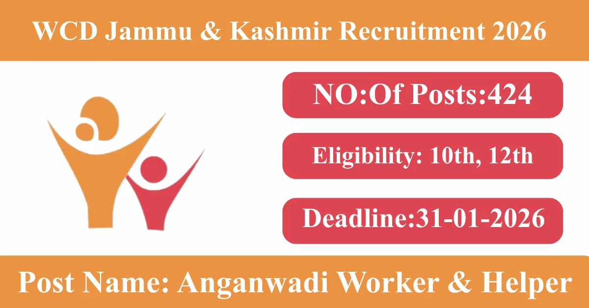WCD Jammu & Kashmir Recruitment 2026: Apply for 424 Anganwadi Worker & Helper vacancies. Women and Child Development Jammu & Kashmir invited applications from eligible and interested candidates to fill up Anganwadi Worker & Helper Posts through WCD Jammu & Kashmir official notification January 2026. Job seekers who are looking for a career in Jammu and Kashmir Government can make use of this opportunity. Interested candidates can Apply Offline on or before 31-Jan-2026