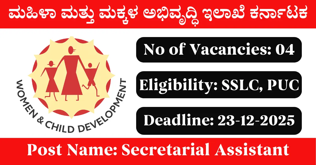 WCD Karnataka Recruitment 2025: Apply for 4 Secretarial Assistant vacancies. Women and Child Development Department Karnataka invited applications from eligible and interested candidates to fill up Secretarial Assistant Posts through WCD Karnataka official notification December 2025. Job seekers who are looking for a career in Bengaluru – Karnataka Government can make use of this opportunity. Interested candidates can Apply Offline on or before 23-Dec-2025
