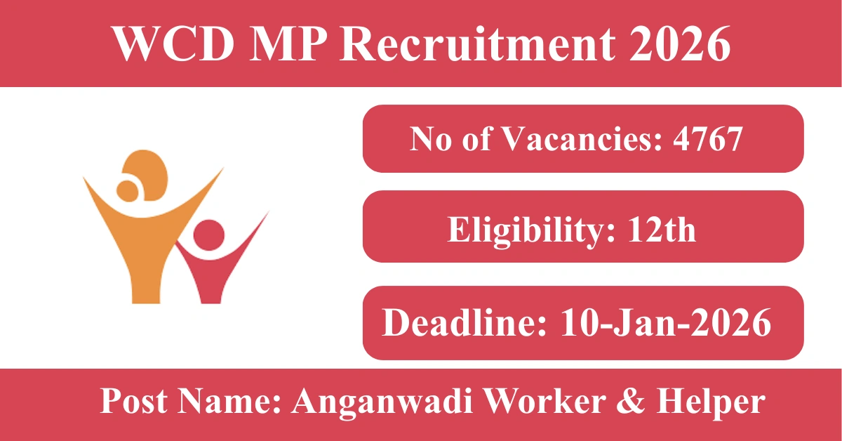 WCD MP Recruitment 2026: Apply for 4767 Anganwadi Worker & Helper vacancies. Women and Child Development Madhya Pradesh invited applications from eligible and interested candidates to fill up Anganwadi Worker & Helper Posts through WCD MP official notification January 2026. Job seekers who are looking for a career in Madhya Pradesh Government can make use of this opportunity. Interested candidates can Apply Online on or before 10-Jan-2026