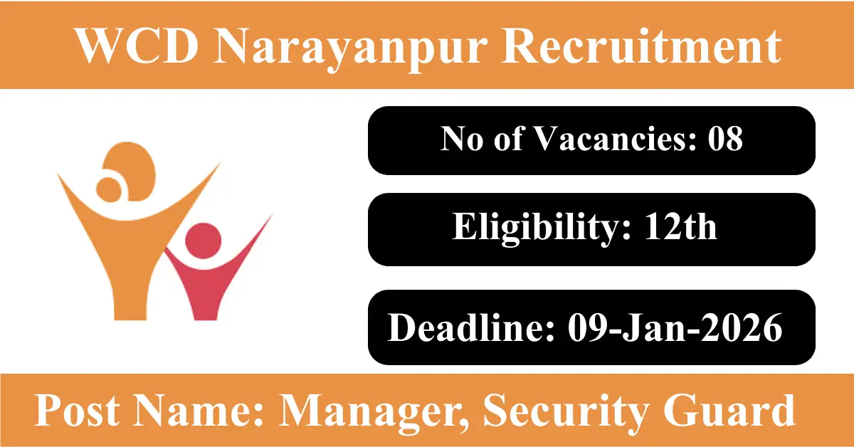 WCD Narayanpur Recruitment 2026: Apply for 8 Manager, Security Guard vacancies. Women and Child Development Narayanpur invited applications from eligible and interested candidates to fill up Manager, Security Guard Posts through WCD Narayanpur official notification December 2025. Job seekers who are looking for a career in Narayanpur – Chhattisgarh Government can make use of this opportunity. Interested candidates can Apply Offline on or before 09-Jan-2026