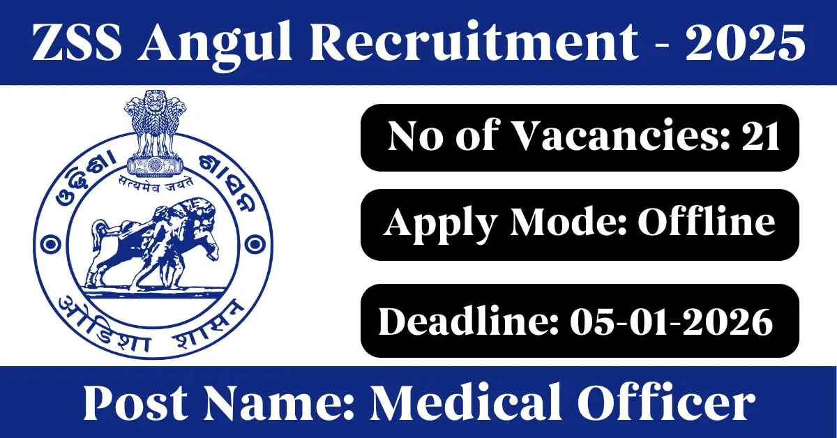 ZSS Angul Recruitment 2025: Apply for 21 Medical Officer vacancies. Zilla Swasthya Samiti Angul invited applications from eligible and interested candidates to fill up Medical Officer Posts through ZSS Angul official notification December 2025. Job seekers who are looking for a career in Angul – Odisha Government can make use of this opportunity. Interested candidates can Apply Offline on or before 05-Jan-2026