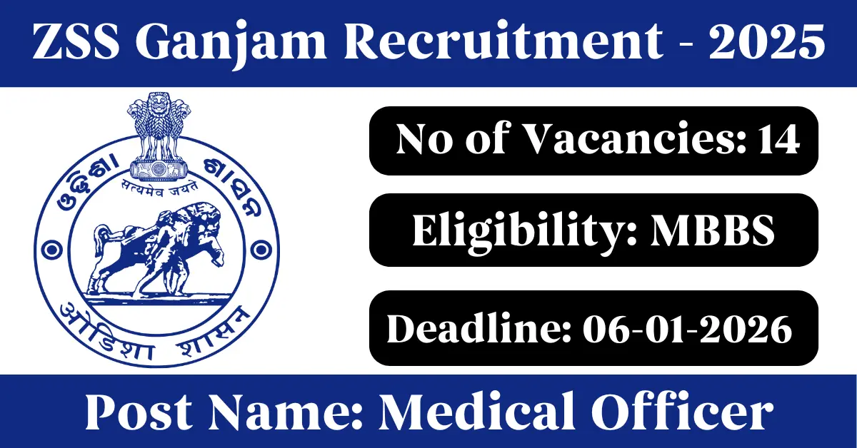 ZSS Ganjam Recruitment 2025: Apply for 14 Medical Officer vacancies. Zilla Swasthya Samiti Ganjam invited applications from eligible and interested candidates to fill up Medical Officer Posts through ZSS Ganjam official notification December 2025. Job seekers who are looking for a career in Berhampur, Ganjam – Odisha Government can make use of this opportunity. Interested candidates can attend for Walk-in-interview on 06-Jan-2026